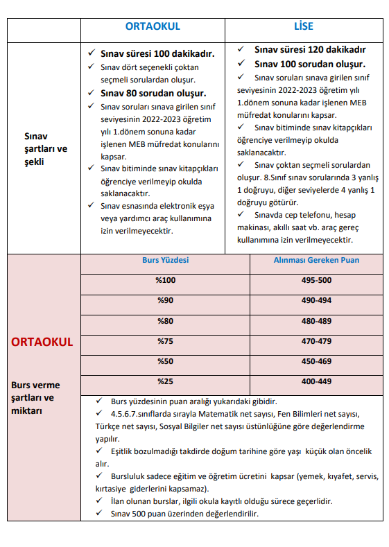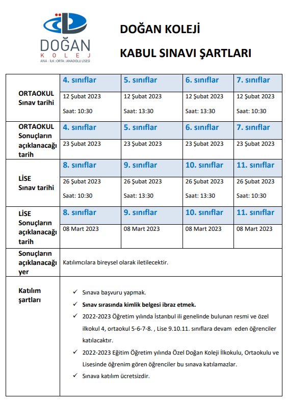 4, 5, 6 ve 7. sınıflarımız için bursluluk sınav tarihimiz  26 Şubat 2023 Pazar olarak güncellenmiştir.